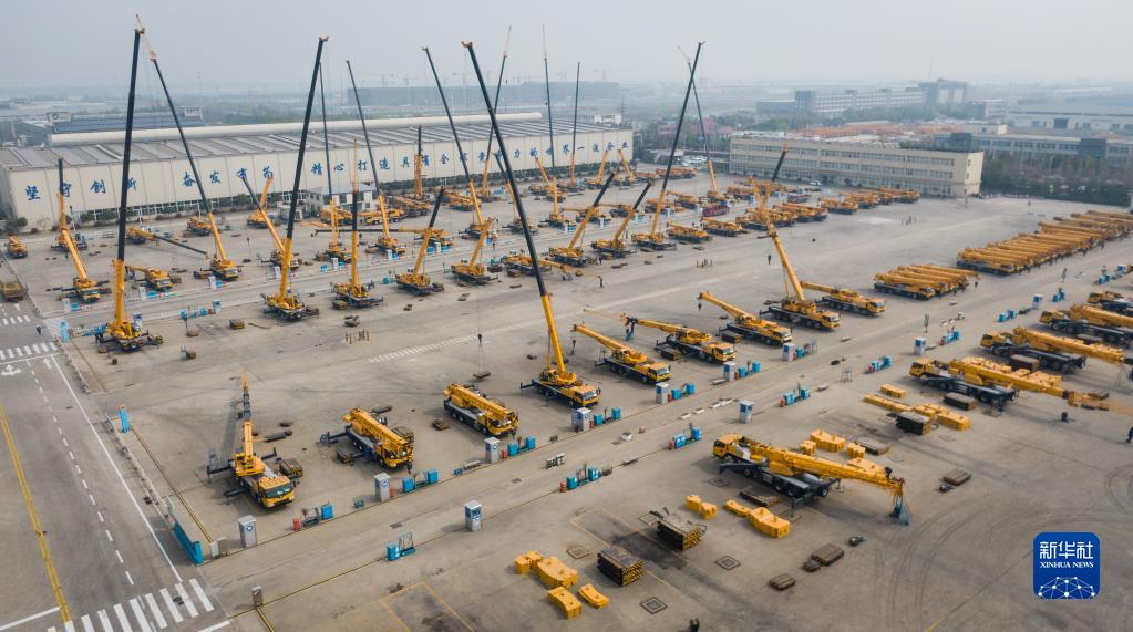 这是2019年4月4日在徐工集团徐州重型机械有限公司拍摄的调试中的起重机(无人机照片)。新华社记者 李响 摄
