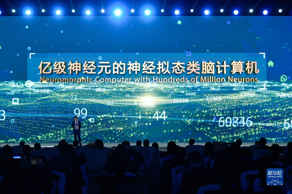 浙江大学、之江实验室代表在“世界互联网领先科技成果发布”活动上介绍“亿级神经元的神经拟态类脑计算机”(2020年11月23日摄)。新华社记者 黄宗治 摄