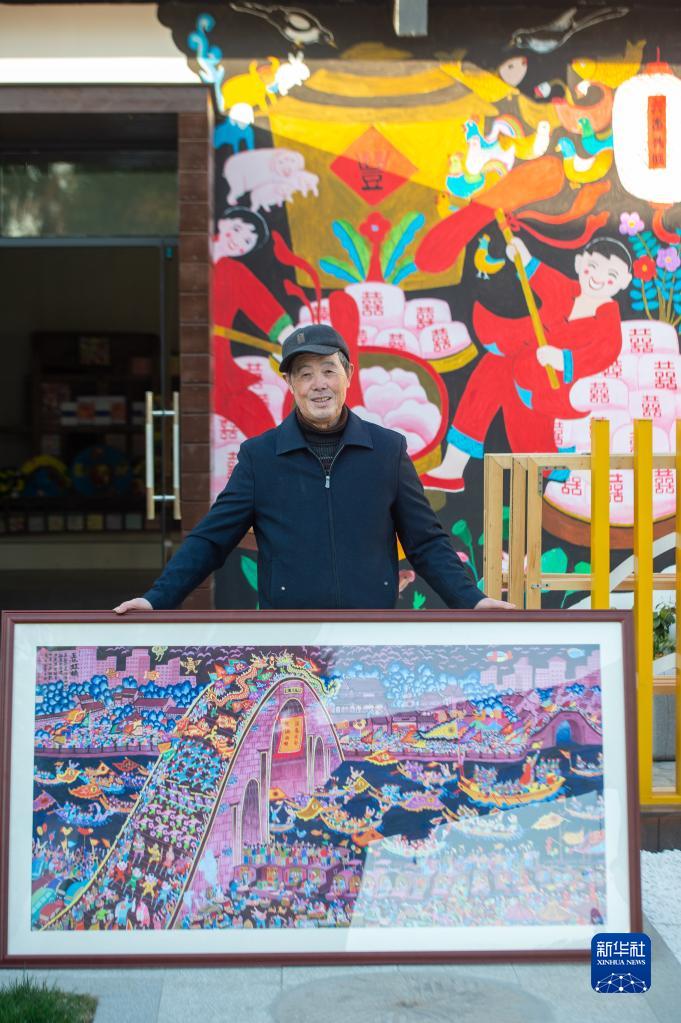 浙江省嘉兴市秀洲区油车港镇胜丰村村民张金泉与自己的画作《国泰民安》合影(2020年12月15日摄)。新华社记者 江汉 摄