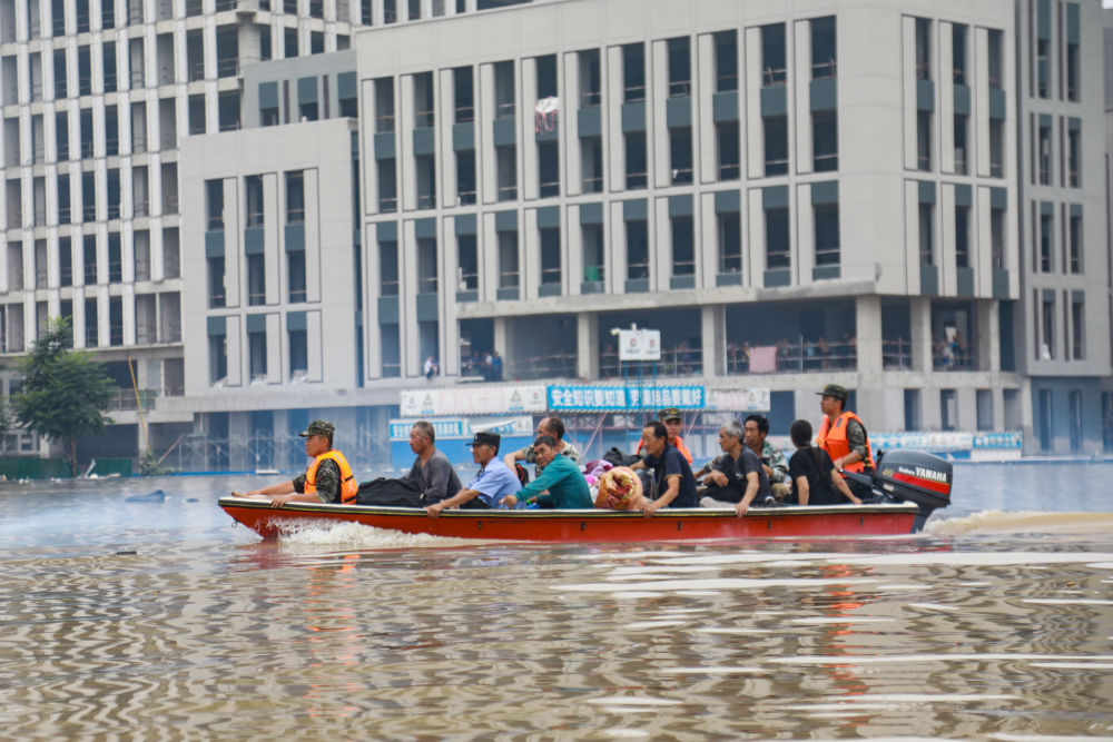 武警河北总队官兵在涿州内涝区域驾舟转移受灾群众(8月4日摄)。新华社发(江腾 摄)